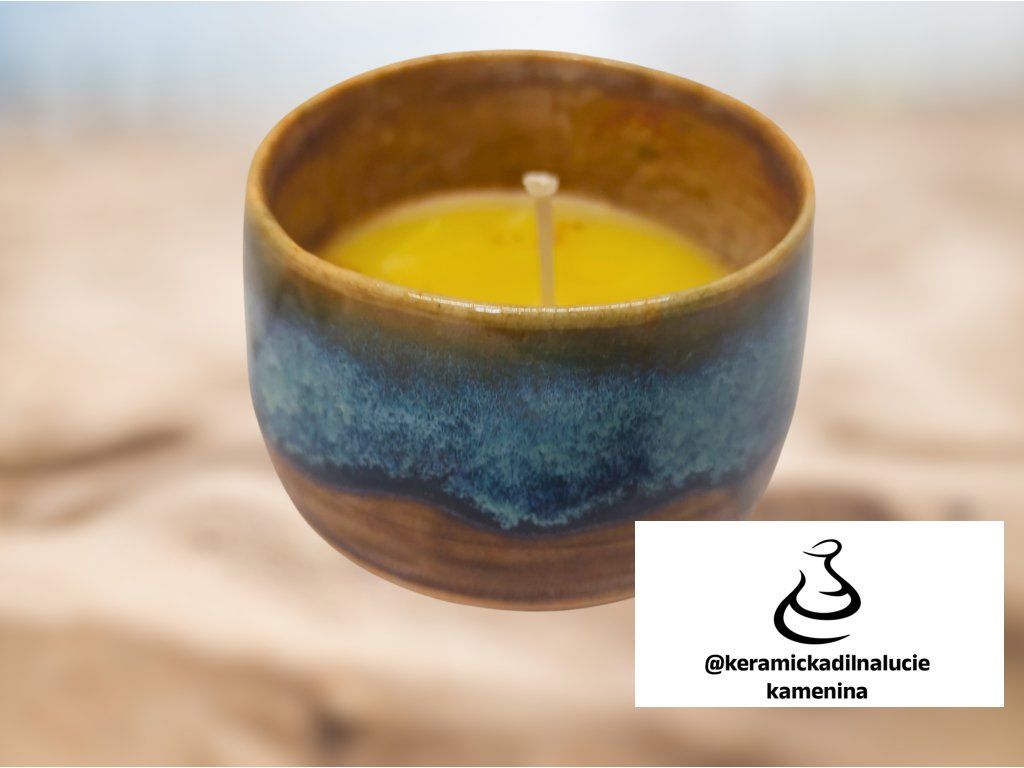 Svíčka z kameniny v efektní glazuře. Pravý včelí vosk. Objem cca 200ml