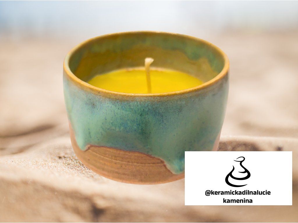 Svíčka z kameniny v efektní glazuře. Pravý včelí vosk. Objem cca 200ml