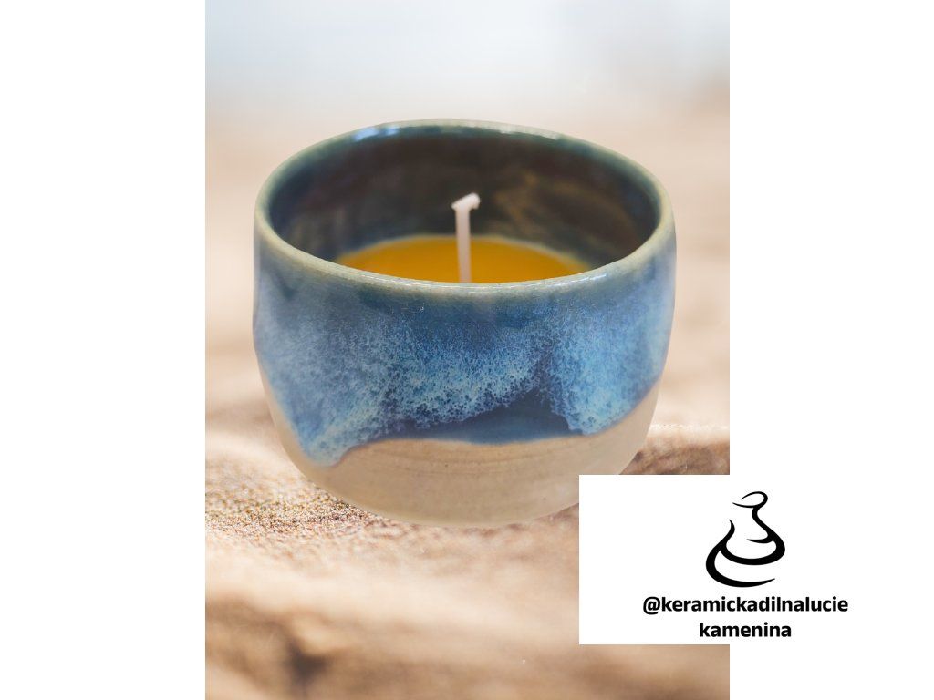 Svíčka z kameniny v efektní glazuře. Pravý včelí vosk. Objem cca 200ml